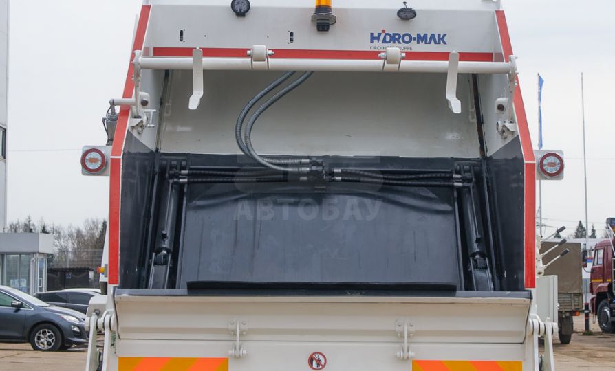 Мусоровоз имеет прессующую плиту, изготовленную из высокопрочной стали, выполняющую функцию забора и прессования отходов из загрузочного бункера в основной (приводится в действие четырьмя гидроцилиндрами), и выталкивающую плиту, которая выполняет функцию обратной нажимной пластины и позволяет производить процесс подпрессовки. В зависимости от плотности отходов, коэффициент уплотнения может увеличиваться до 1:6.
